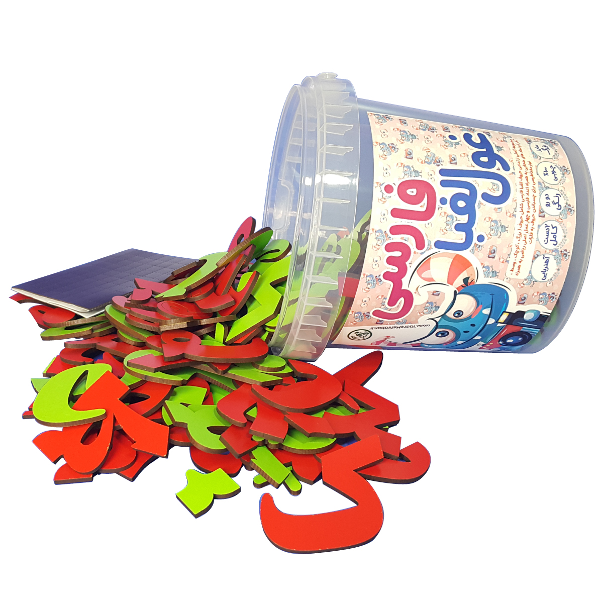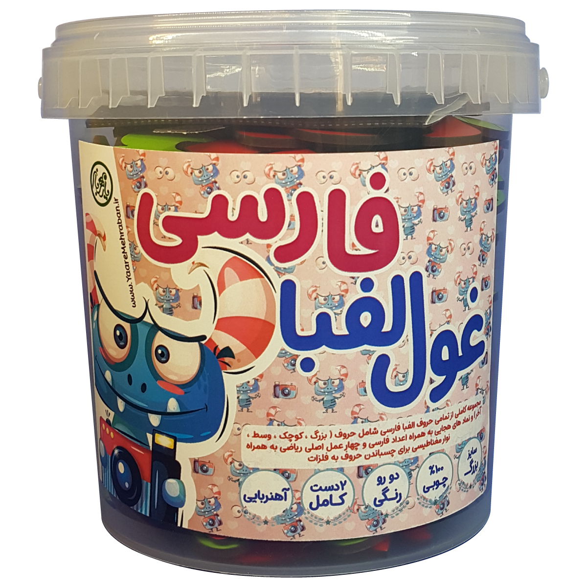 بسته غول الفبا شامل 2 سری کامل حروف الفبای فارسی شامل حروف بزرگ-کوچک و وسط می باشد به همراه نوار مغناطیسی برای چسباندن حروف به سطوح فلزی